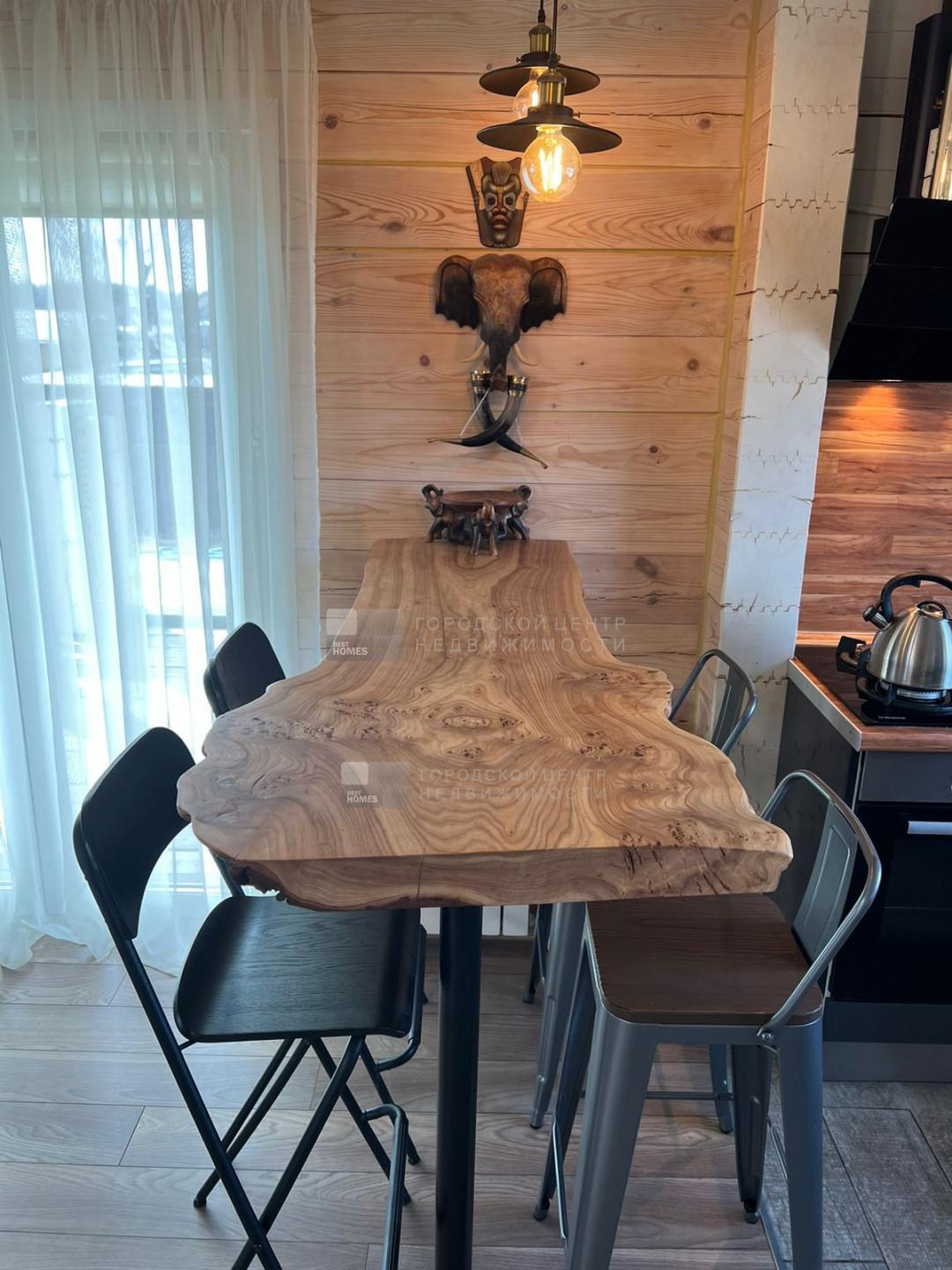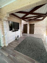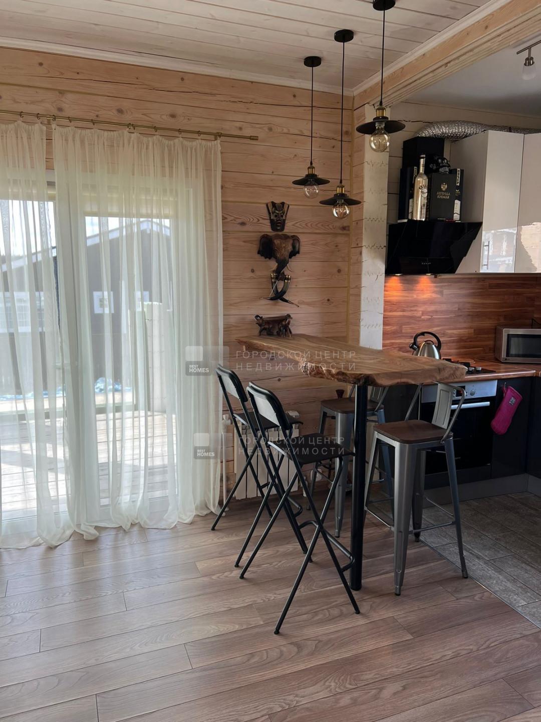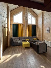 1 эт. крытое крыльцо, светлая просторная гостиная со вторым светом (потолки 7 м), большая кухня с барной стойкой из натурального дерева, столовая с выходом на крытую террасу 30м2, спальня, с/у с душевой кабиной, котельная, кладовая
