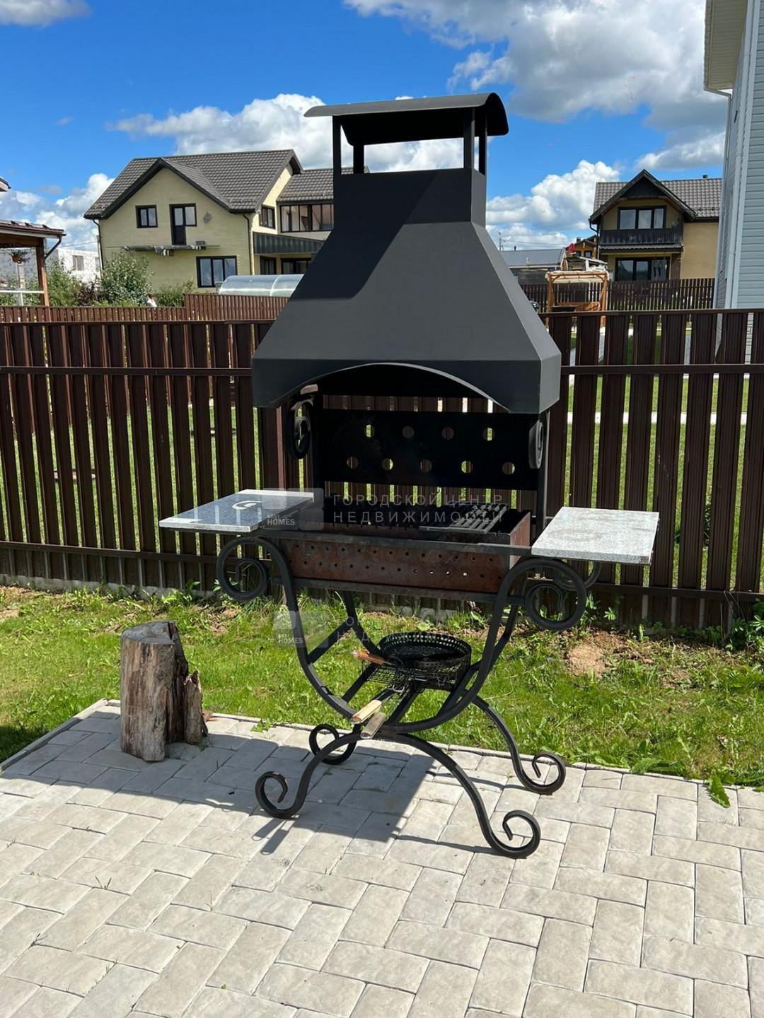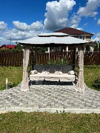 Выделена мангальная зона, установлены садовые качели, укрытые балдахином.