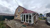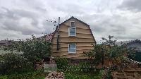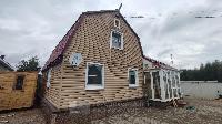 Дом построен по каркасной технологии, фундамент - винтовые сваи, облицовка - сайдинг.
