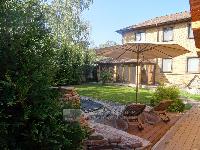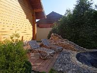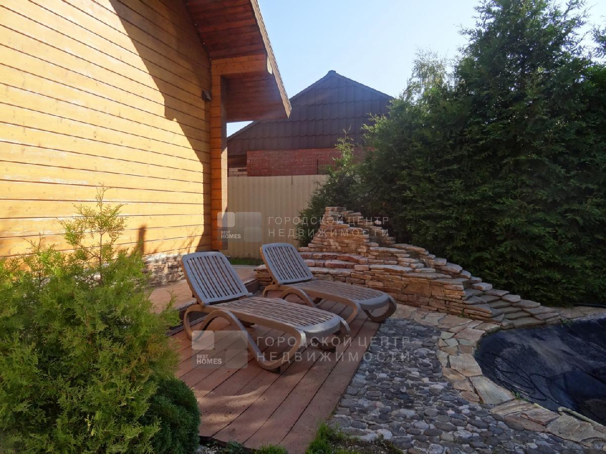 Участок красивый ландшафт, где выход из двух домов к пляжной зоне с шезлонгами, прудиком и водопадом из златолита и уральского лемезита, сделанный на века.