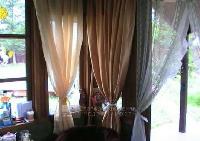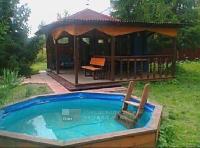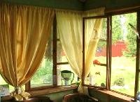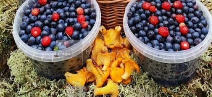 Второе строение - остекленная кухня с большой верандой под крышей. К ней подведена вода, газ баллон в сейфе. Позади кухни хозблок. Отдельно стоящий сан узел - в котором туалет и душевая. Вода из колодца. Все строения выполнены в одном стиле - отделаны блок-хаусом. Окна резные, на крышах стильные флюгеры. Дорожки выложены декоративной плиткой.
