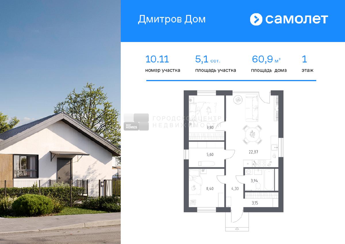 В продаже дом площадью 60,9 м2 на участке 5.14 от застройщика «Самолет» в загородном проекте «Дмитров Дом».