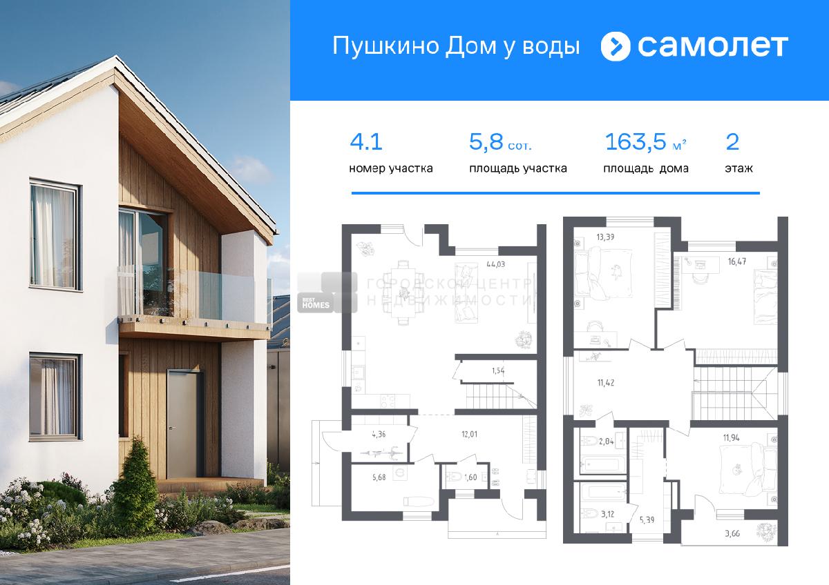 В продаже дом площадью 163,5 м2 на участке 5.84 от застройщика «Самолет» в загородном проекте «Пушкино дом у воды».