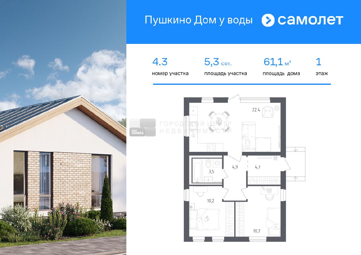 В продаже дом площадью 61,1 м2 на участке 5.25 от застройщика «Самолет» в загородном проекте «Пушкино дом у воды».