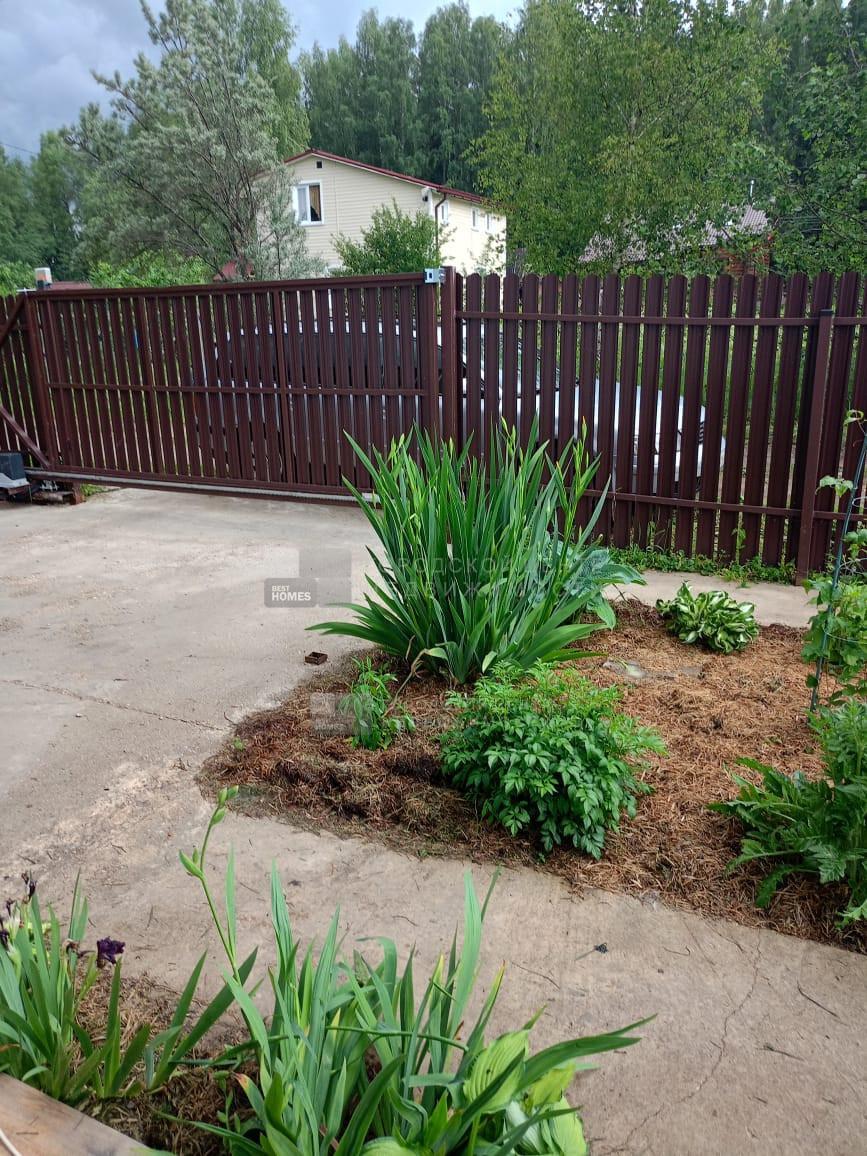 Со всех сторон огорожен забором (по фасаду металлический штакетник, с остальных трех сторон сетка рабица).