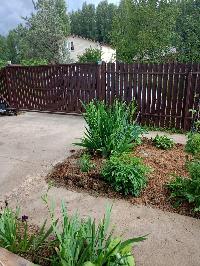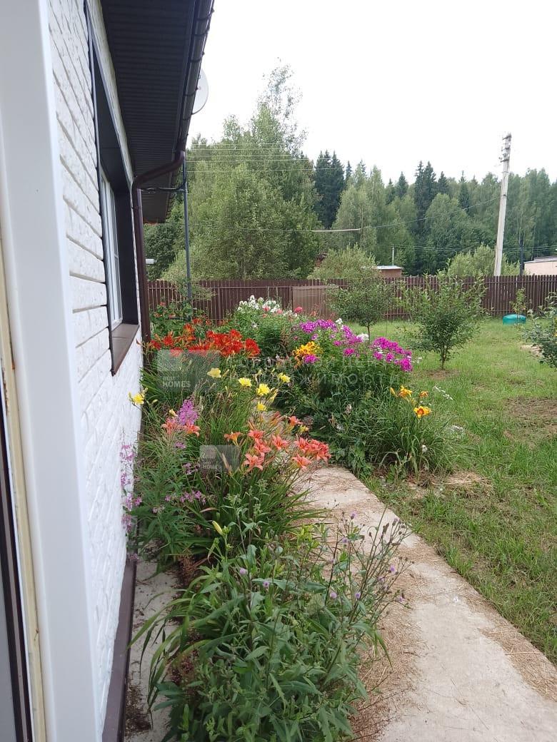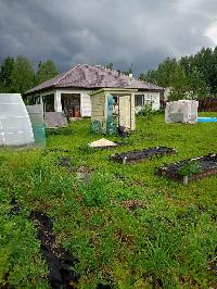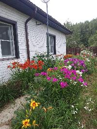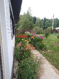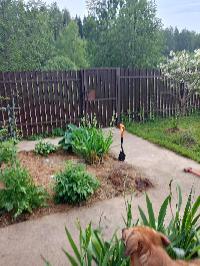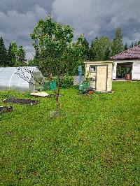 На участке молодой сад (яблони, груши, сливы, смородина, крыжовник, малина, жимолость, ежевика), много цветов.