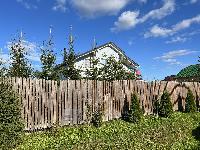 Вдоль забора по фасаду участка высажены пушистые ели, есть береза и туи.