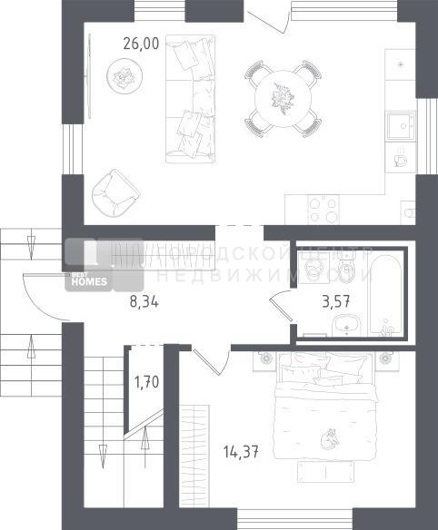 В базовую комплектацию включена металлическая входная дверь, двухкамерные стеклопакеты. Отсутствие межкомнатных перегородок позволит вам адаптировать пространство под себя.
