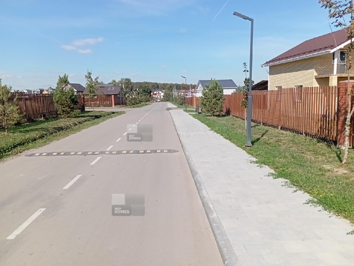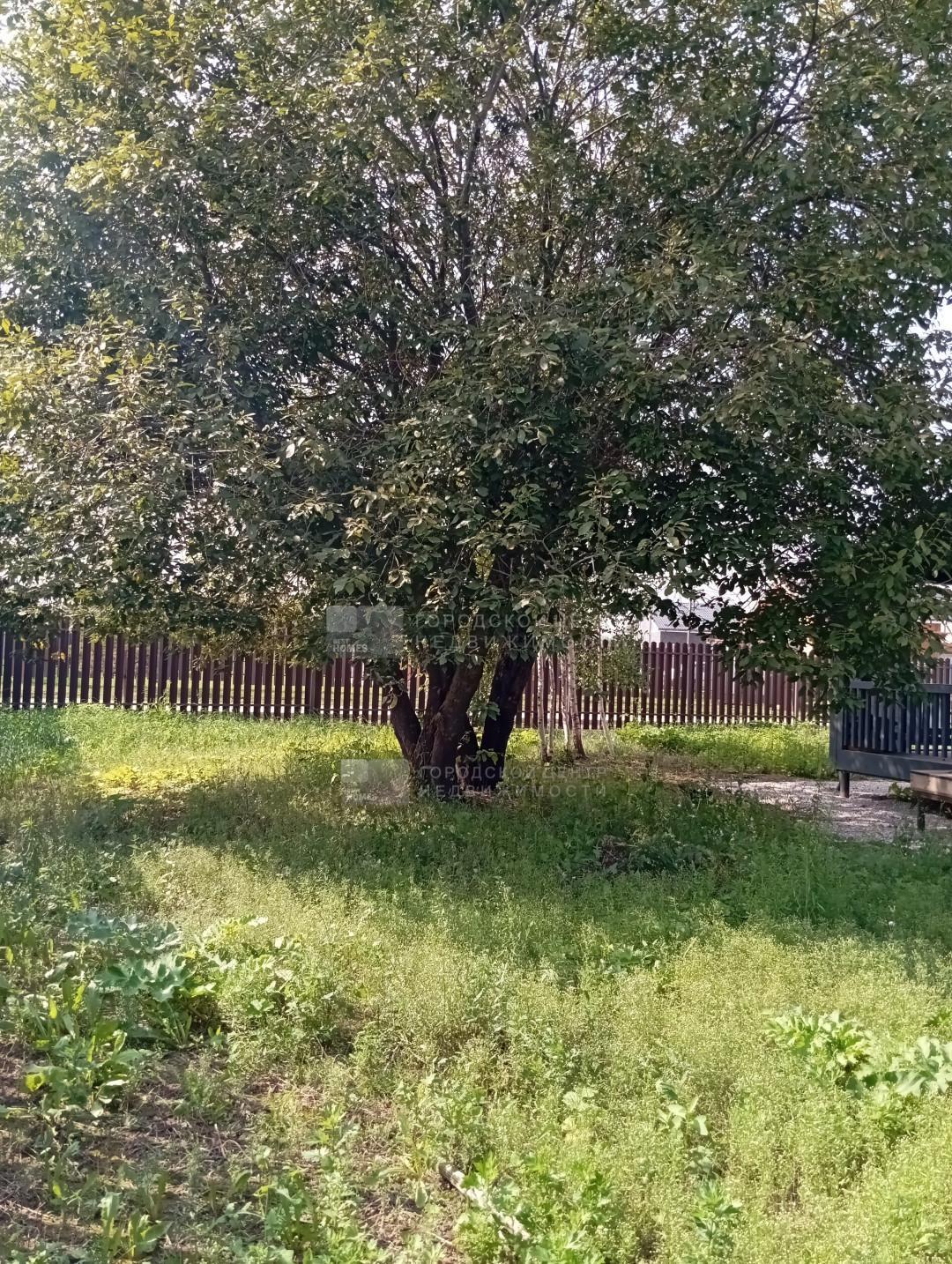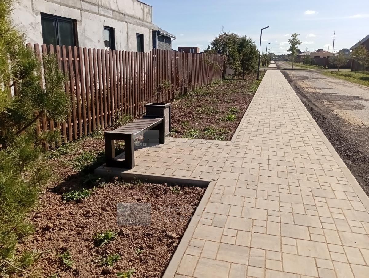 Участок огорожен декоративным металлическим штакетником (однотипным для всего поселка). Перед домом - парковка на две машины. На участке растут взрослые деревья.
