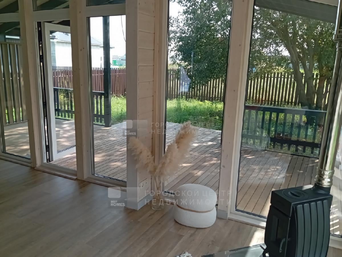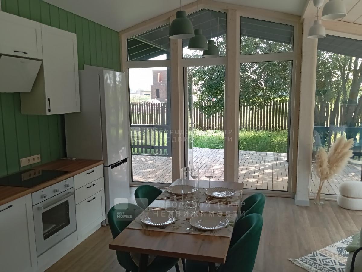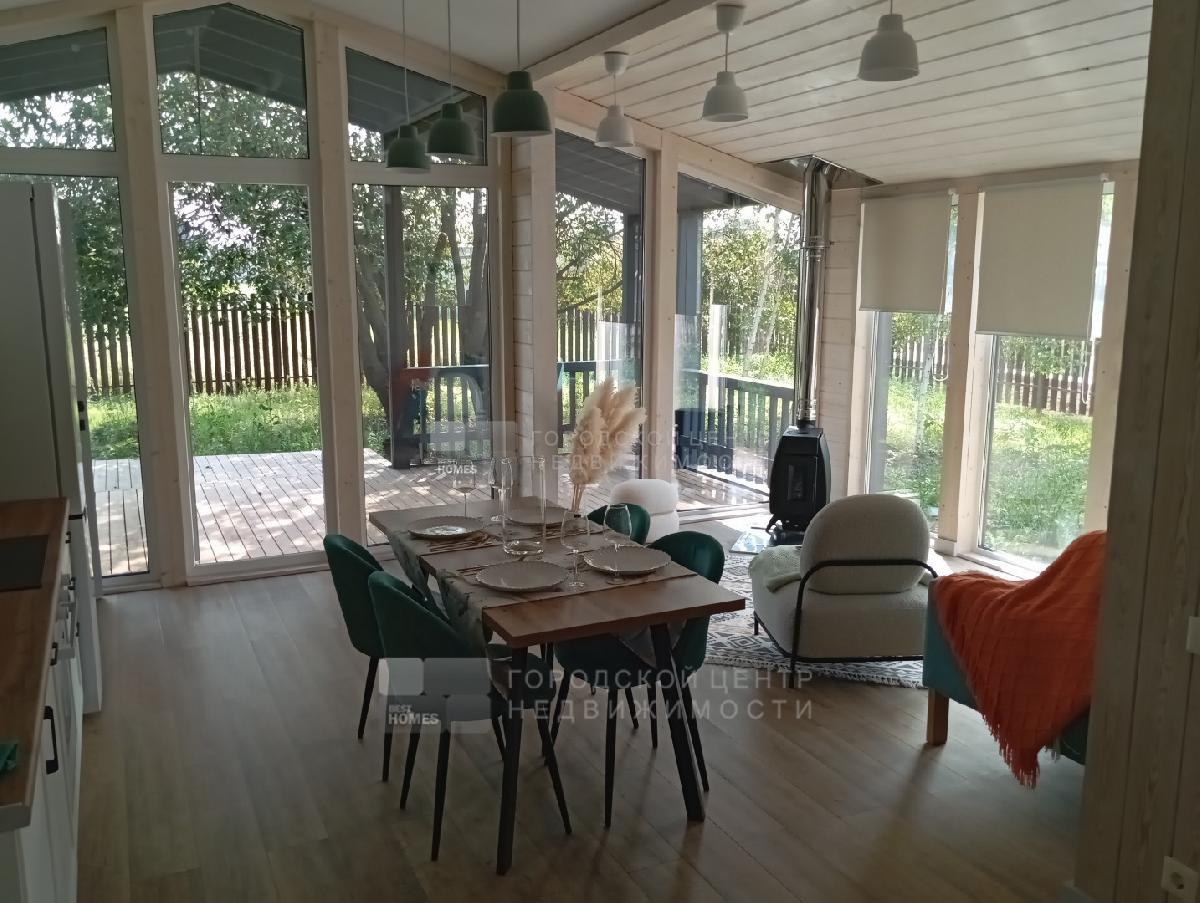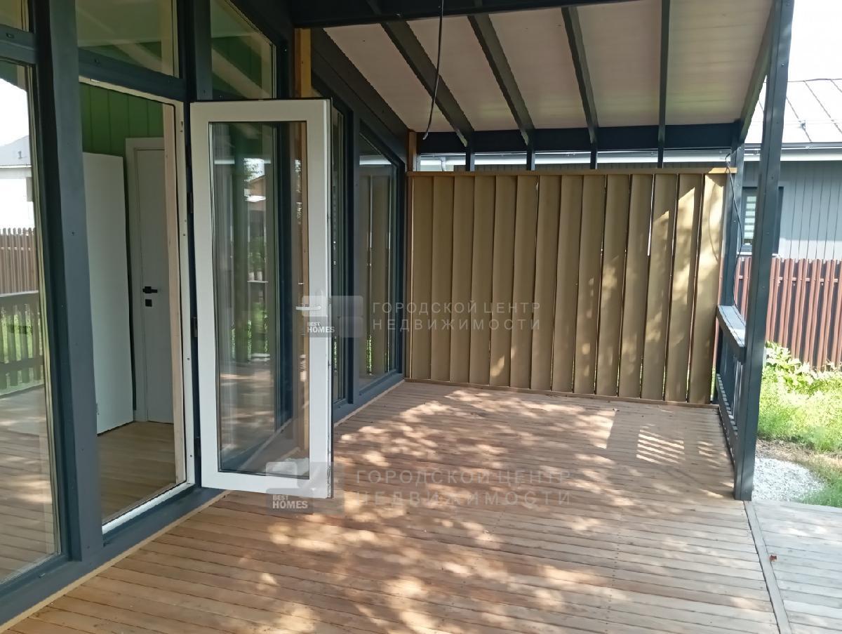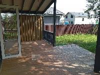 В доме три спальни 9,9; 9,8 и 7,3 кв.м., Прихожая - 3,1 кв.м., с/у с ванной - 4,0 кв.м.. Кухня-гостиная - 26,2 кв.м. с выходом на веранду под козырьком. Пол на веранде - лиственница.