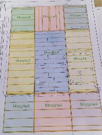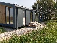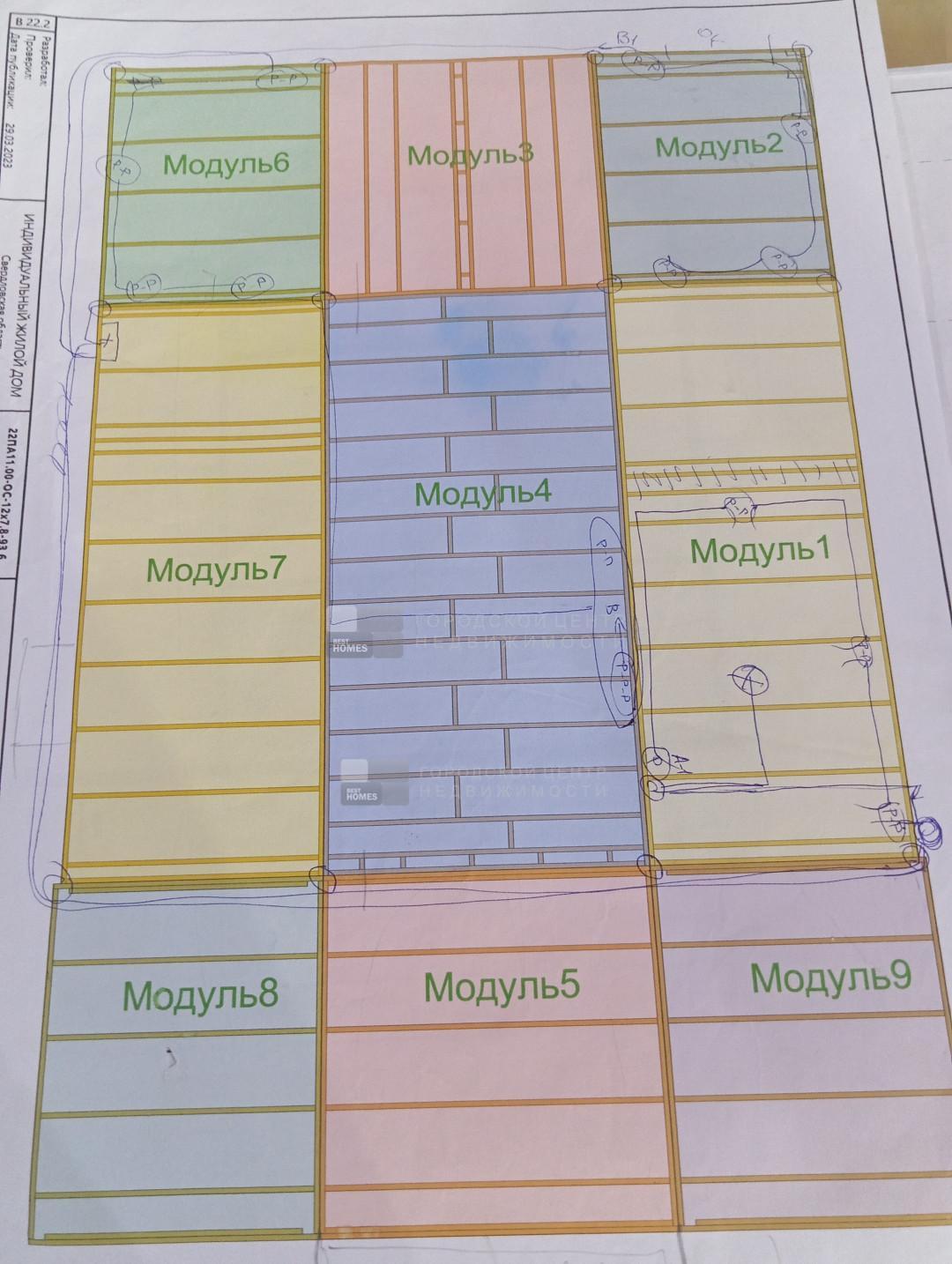 Дом построен по модульной технологии и состоит из девяти модулей. Модули полностью изготавливались в цеху, затем автовозом привозились и устанавливались на подготовленном фундаменте .На самом участке монтировалась только кровля и подключались коммуникации. Такая технология позволяет утеплить дом как единую цельную оболочку без мостиков холода на стыке пола и стен и стен и потолка. Каркас модулей изготавливается из строганной доски камерной сушки обработанной огнебиозащитой 1-ой категории.