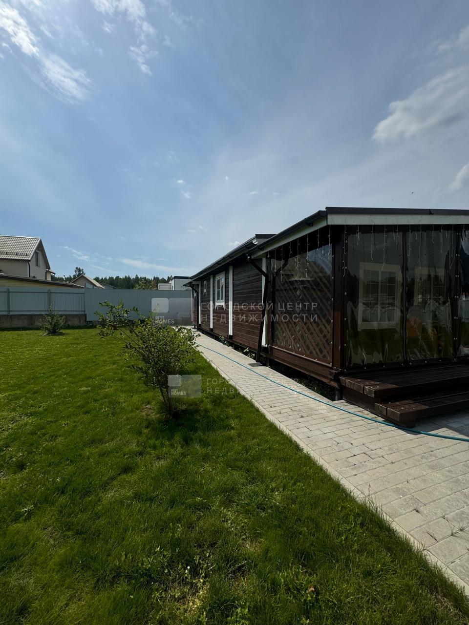 Дом расположен в дальней части участка. От ворот к нему ведет широкая выложенная брусчаткой дорожка.