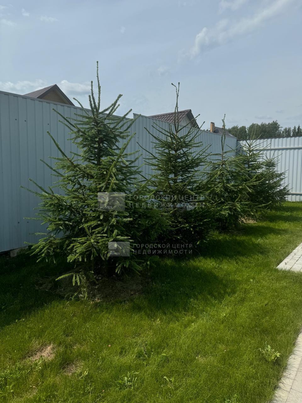 Посажен молодой сад (яблони, вишни, сливы, смородина, крыжовник). по периметру небольшие туи и ели, есть несколько грядок с клубникой.