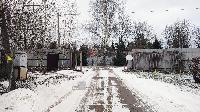 На въезде на улицу, которая освещается в темное время суток, откатной шлагбаум.