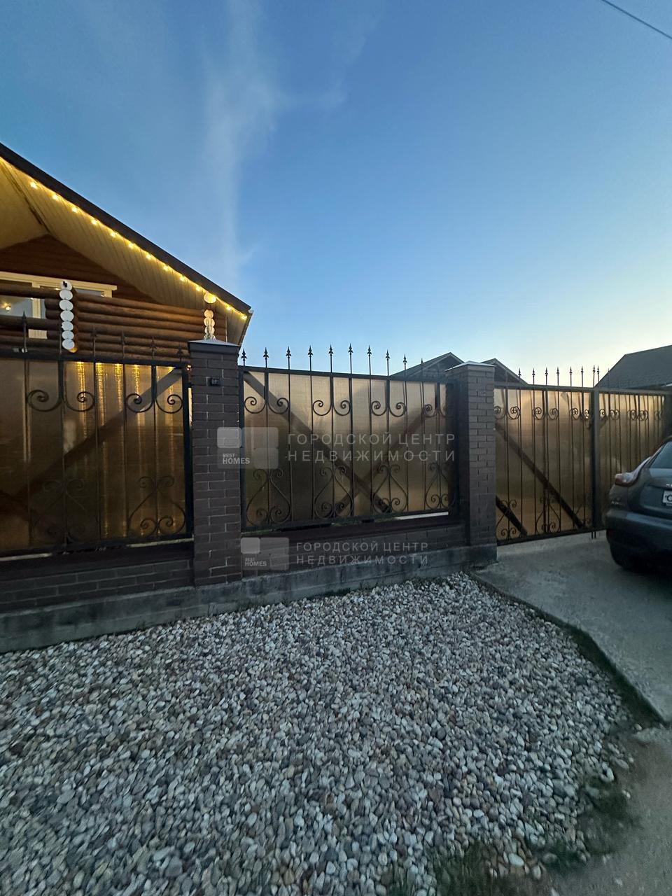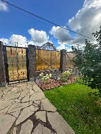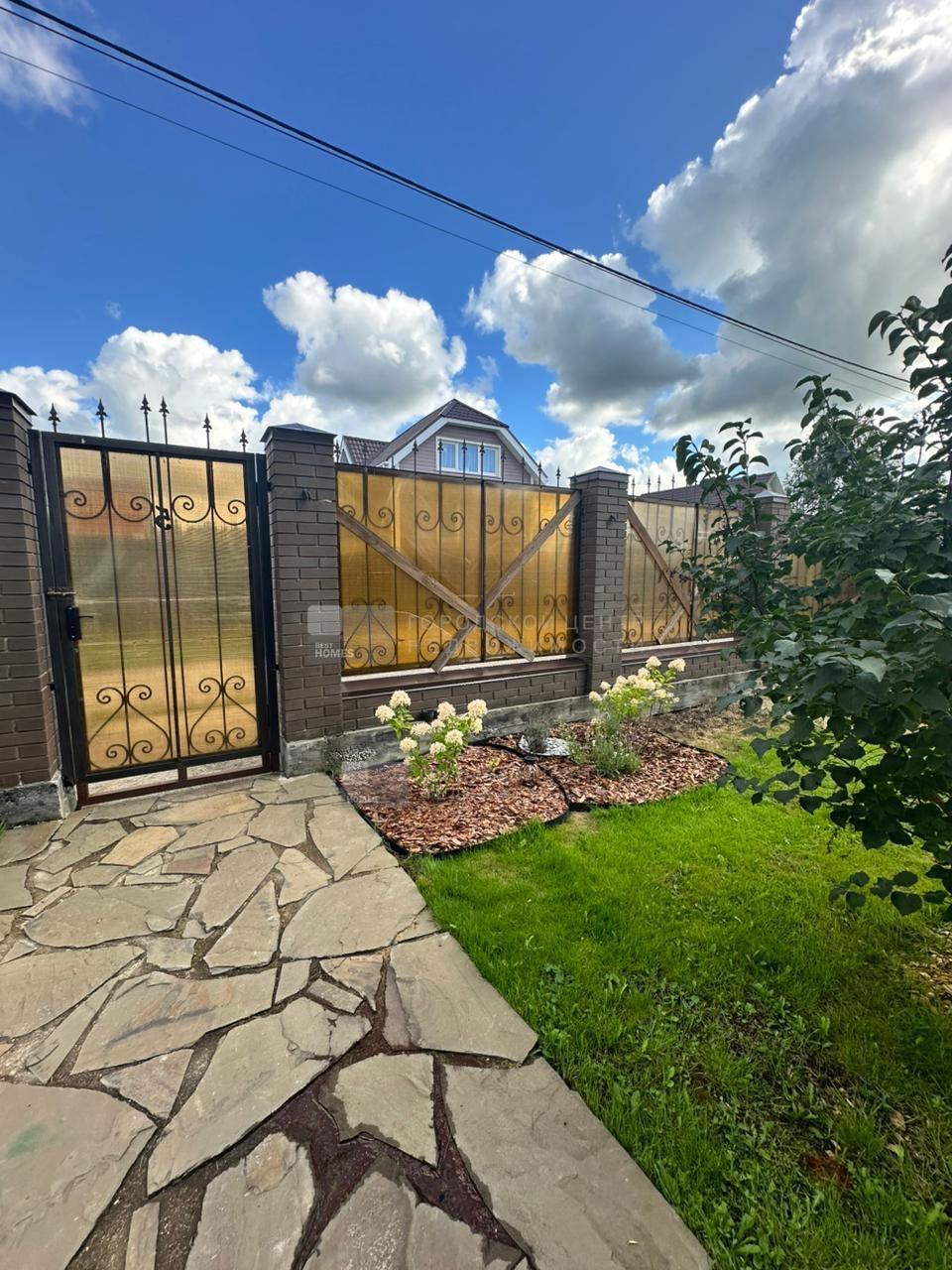 Ровный правильной формы участок 7,56 соток со всех сторон огорожен забором: по фасаду красивый кованый забор с кирпичными столбами и со стильными полупрозрачными поликарбонатовыми вставками, справа и сзади профнастил, слева деревянный штакетник.