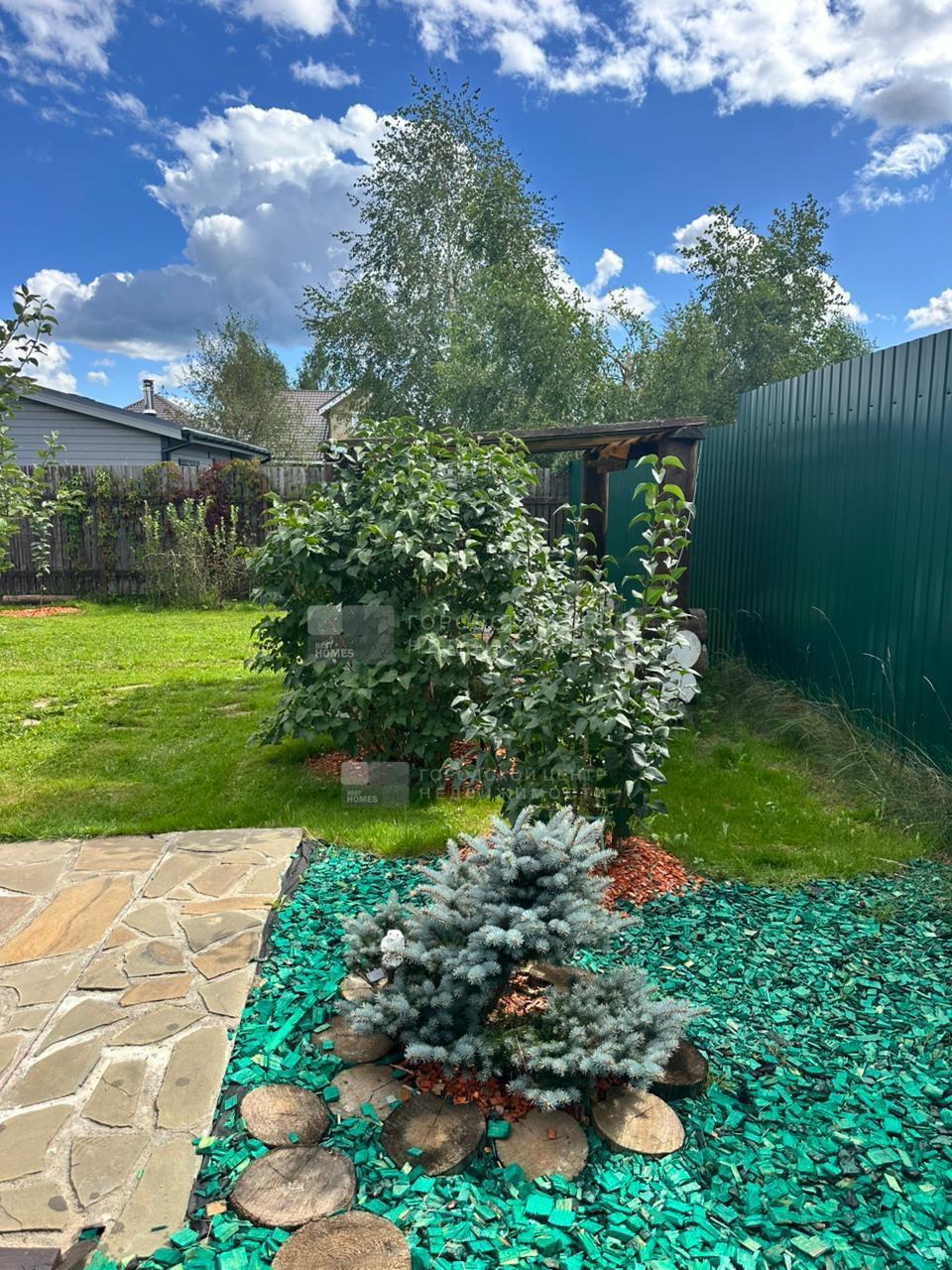 Выполнен ландшафтный дизайн, посажены молодые яблони, вишни, груши, крыжовник, смородина, малина, ежевика, жимолость, сирень,