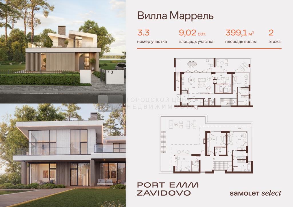 В продаже вилла площадью 399,1 м2 на участке 9,31 соток от застройщика «Самолет» в загородном проекте PORT EMM ZAVIDOVO.