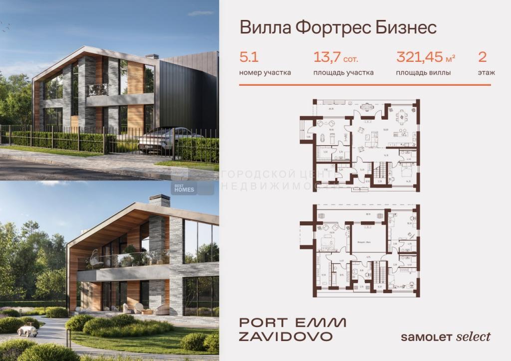 В продаже вилла площадью 321,45 м2 на участке 13,7 соток от застройщика «Самолет» в загородном проекте PORT EMM ZAVIDOVO.
