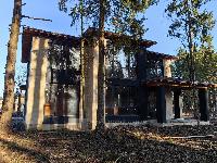 Кровли с минимальным уклоном и увеличенными свесами, колонны с прямыми углами относят посёлок к популярному архитектурному стилю Фрэнка Ллойда Райта.