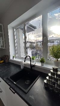 В доме водяные теплые полы, материал пола керамогранит, стены обои и покраска, потолок натяжной, в доме установлена сантехника и освещение.