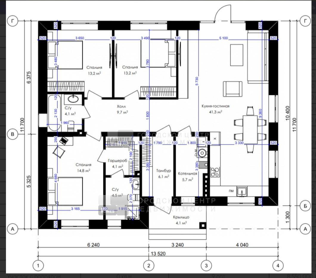 Дом имеет 3 спальни, 2 санузла, большую кухню-гостиную.