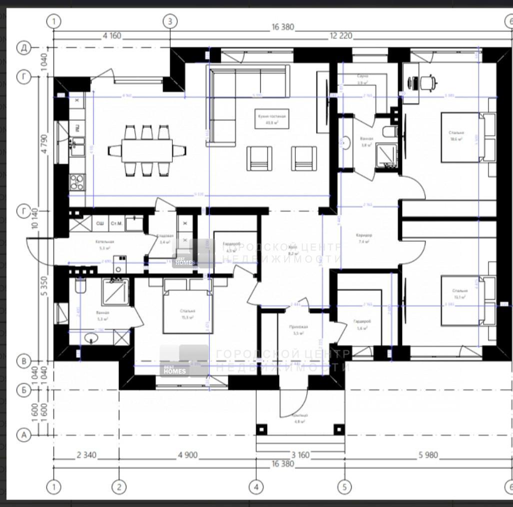 Дом имеет 3 спальни, 2 санузла, большую кухню-гостиную.