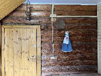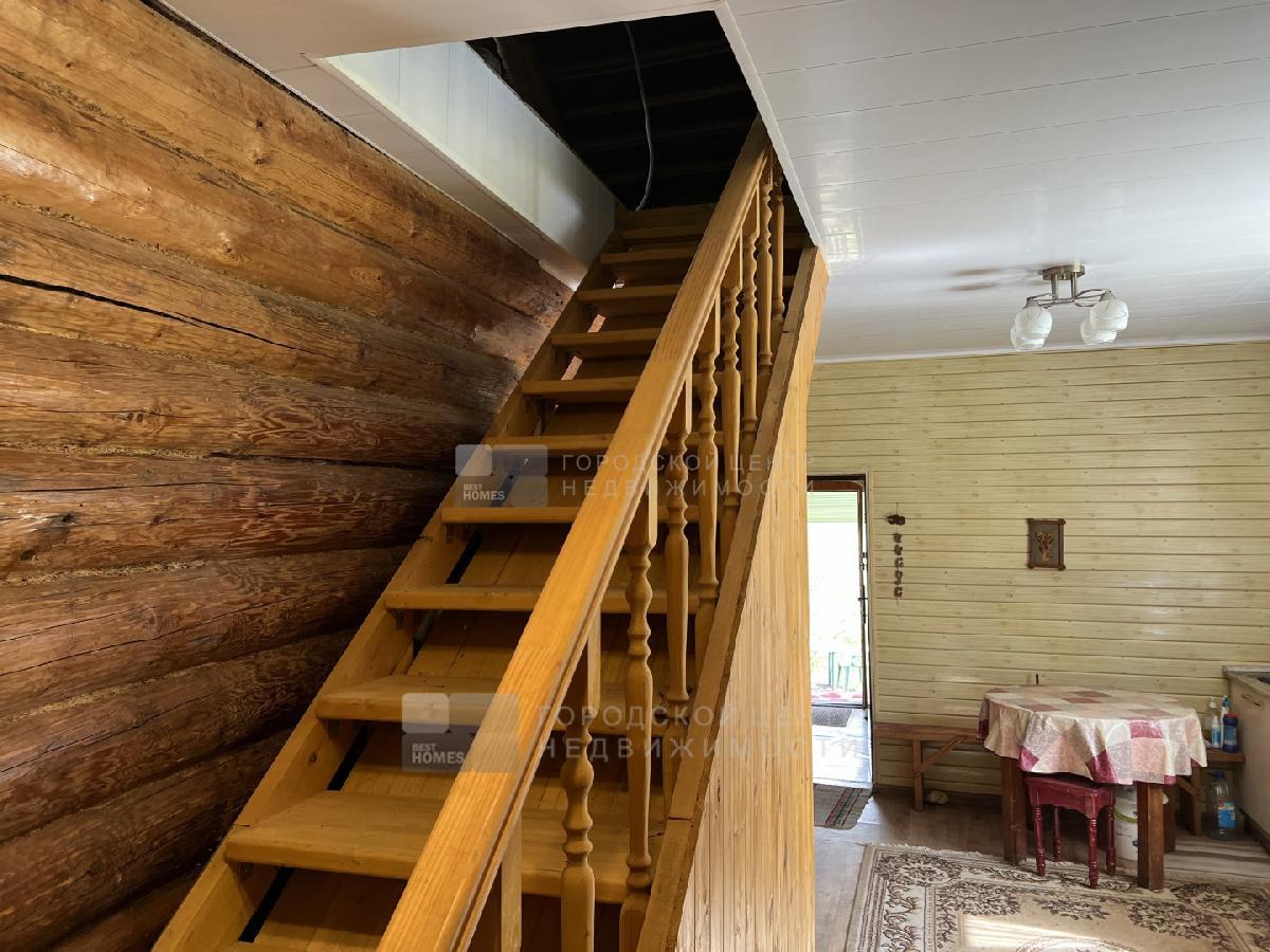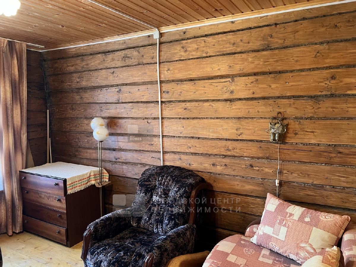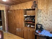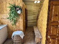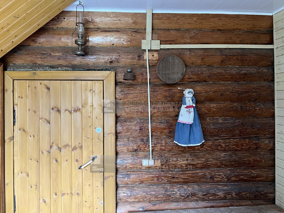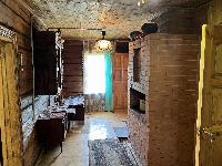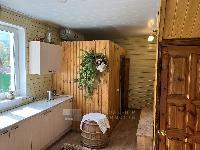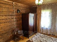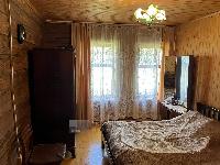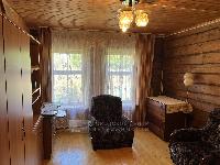 Дом построен из настоящего бревна ручной рубки (лафет) диаметром 220-260мм. Снаружи обшит светлым сайдингом. Очень теплый.