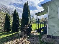Перед домом со стороны дороги растет огромная пушистая ель и пара берез.