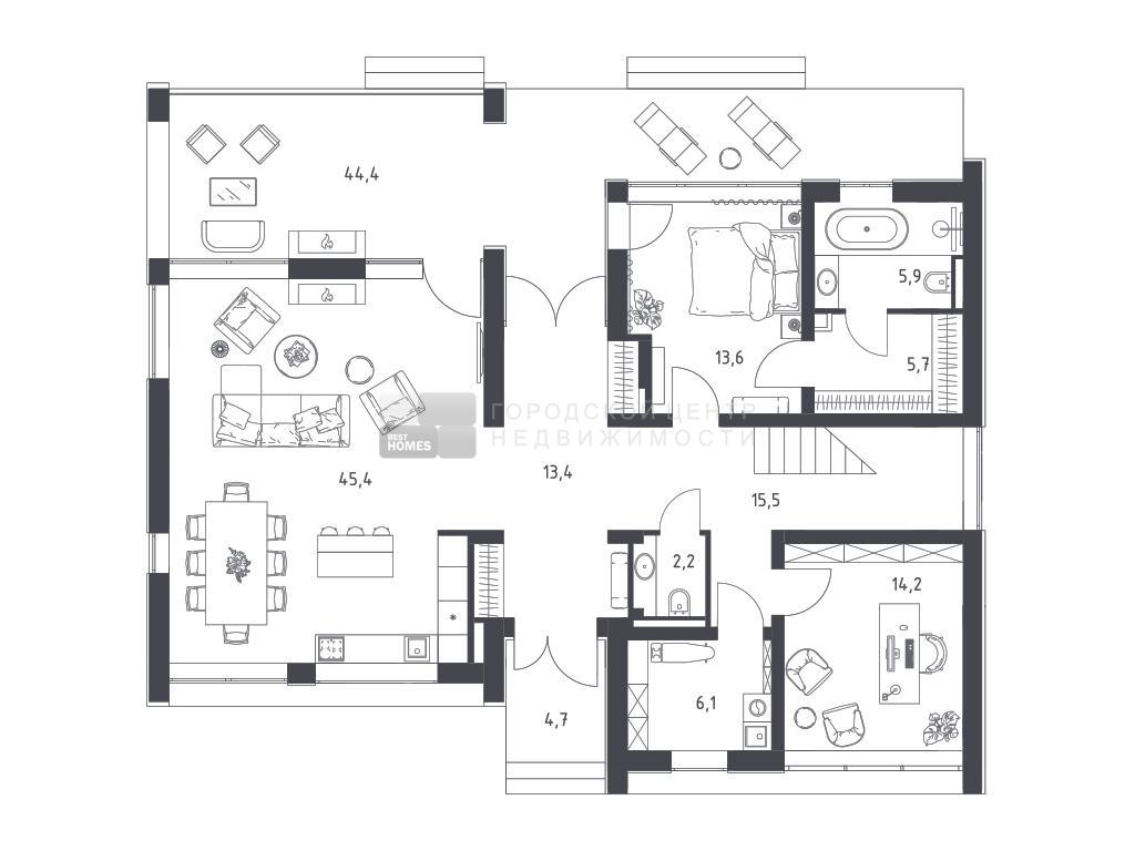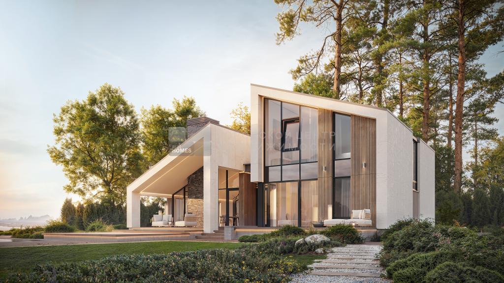 Панорамная релакс-зона в гостиной со вторым светом, камином и выходом на уютную террасу – прекрасное место для отдыха и вдохновения. Тектоничное и устойчивое формообразование, вдохновленное современной архитектурой, естественными материалами и переосмыслением стиля шале. Уютные балконы обеспечат дополнительное пространство для отдыха на природе с повышенным комфортом.