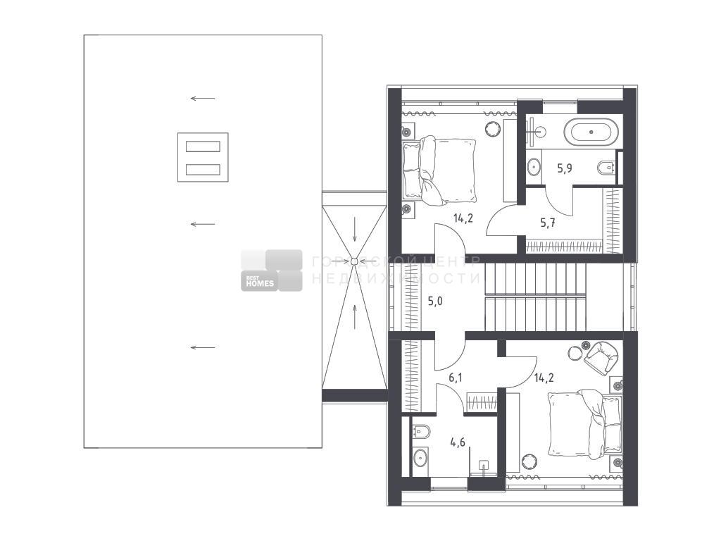Вилла “Дэнфорд” – это пространство для здоровья и отдыха. На первом этаже расположена мастер-спальня со своей ванной и гардеробной, кабинет и кухня-гостиная. На втором этаже – 2 мастер-спальни со своими ванными и гардеробными комнатами. Выразительная двухчастная структура дома, позволяющая автономно реализовывать различные сценарии жизни для большей приватности.