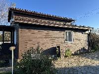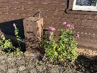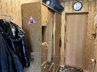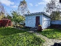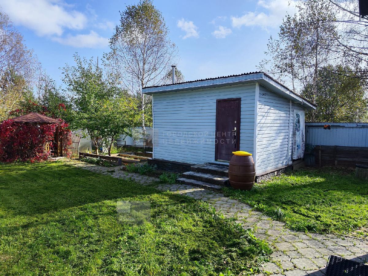 На участке баня с дровяной печью, обшитая светлым сайдингом. С задней стороны бани хозблок для садового инвентаря.