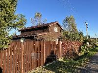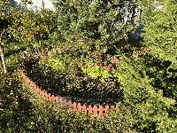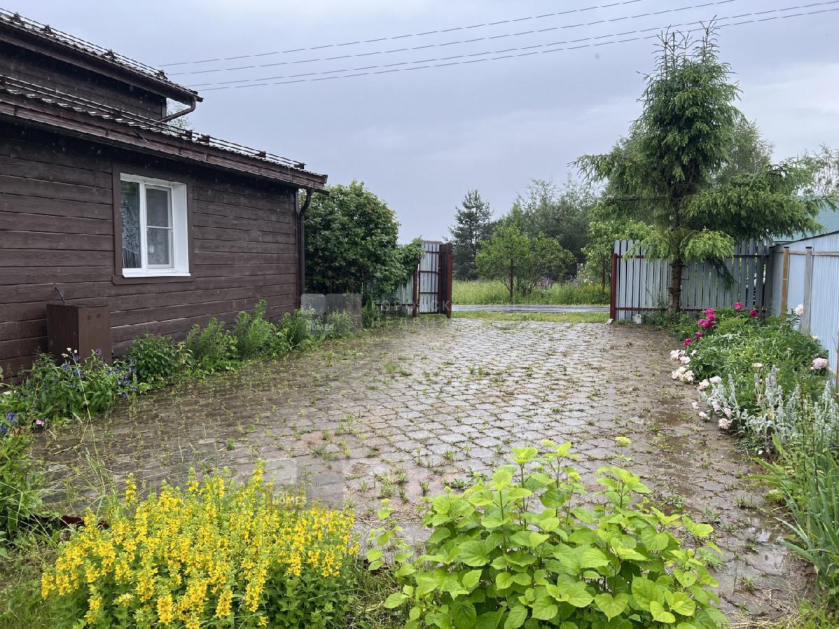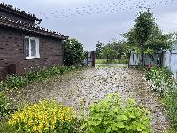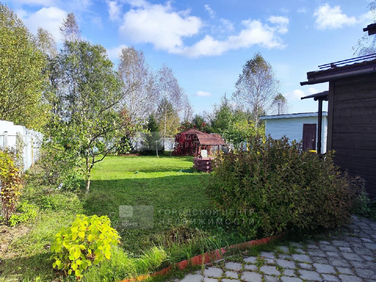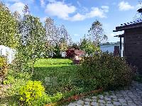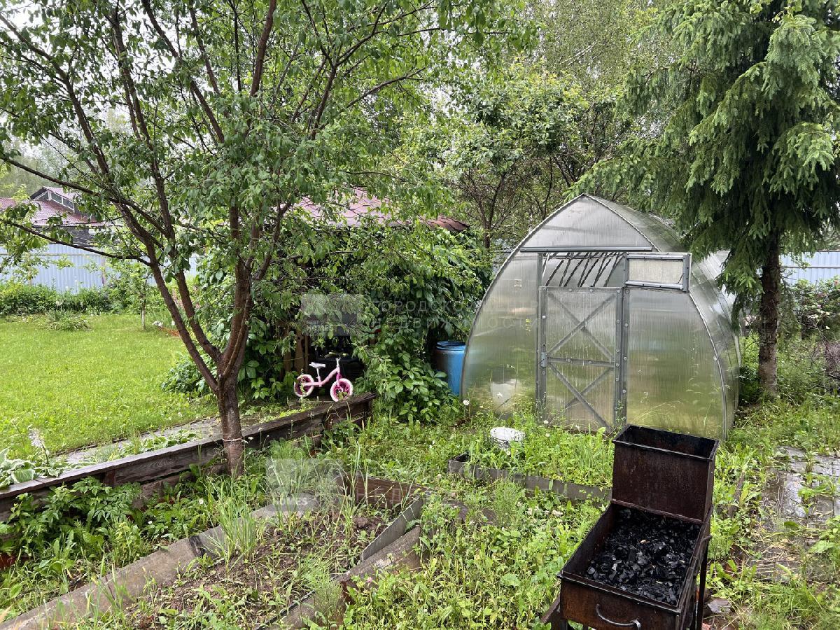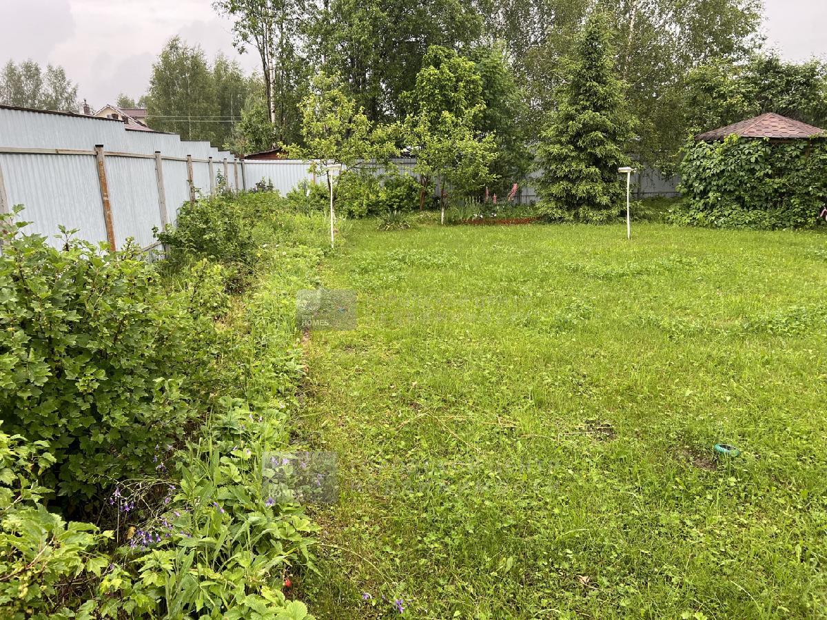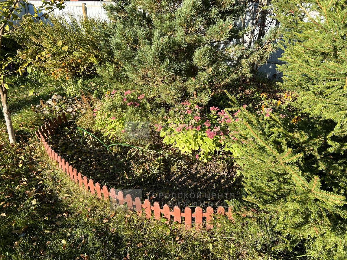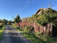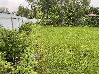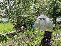 Ровный участок 8,0 соток выровнен, обработан. Регулярно прокашивается. Справа по забору и в дальней части участка растут несколько пушистых елочек, сосенок и стройные березки. Под ними укрылась аккуратная беседка.