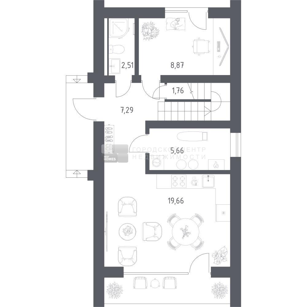 В базовую комплектацию включена металлическая входная дверь, двухкамерные стеклопакеты. Отсутствие межкомнатных перегородок позволит вам адаптировать пространство под себя.