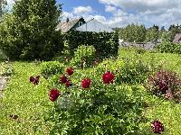 Огромные гортензии с пушистыми белыми шапками, ирисы, розы, пионы флоксы и другие цветы.