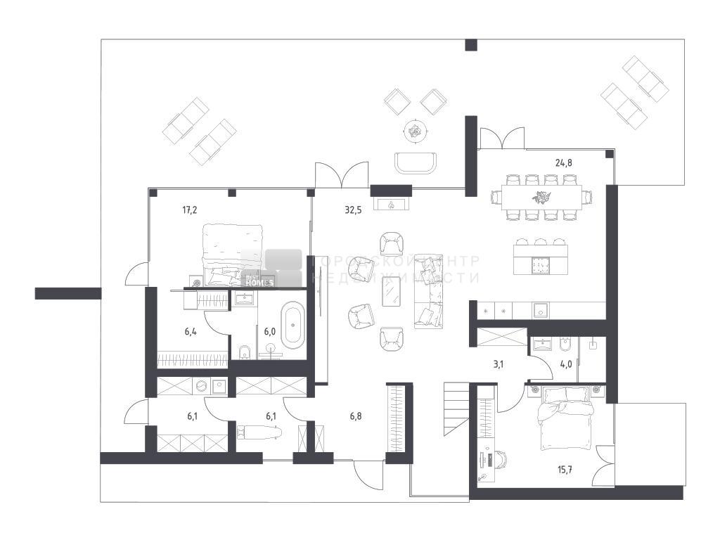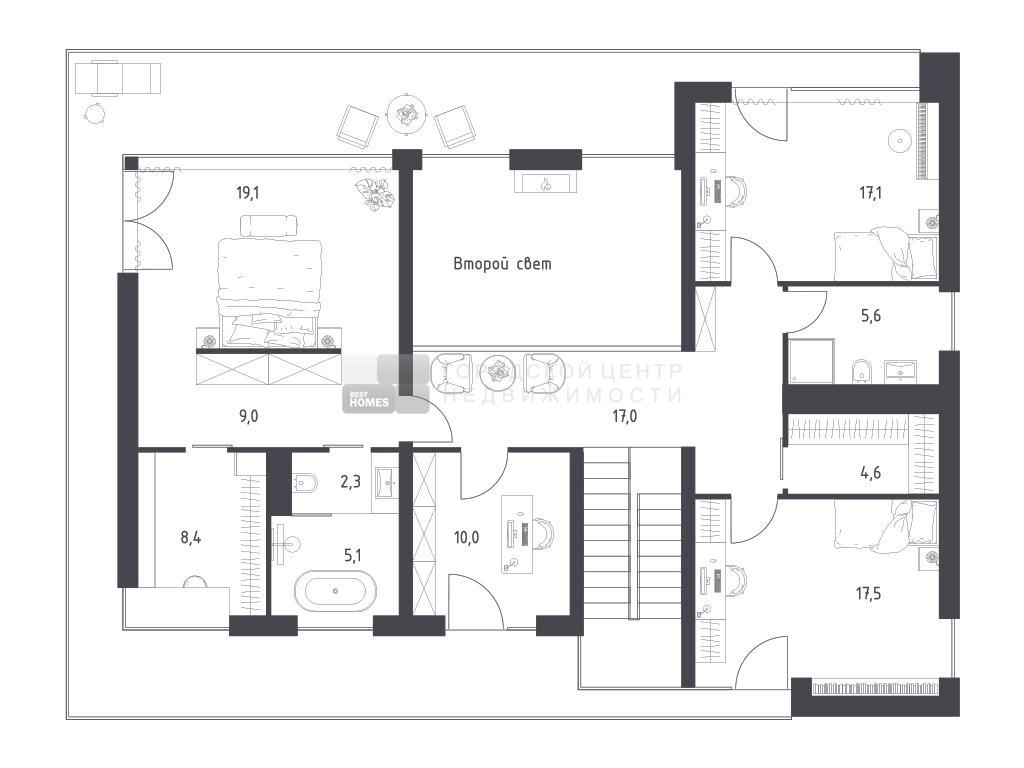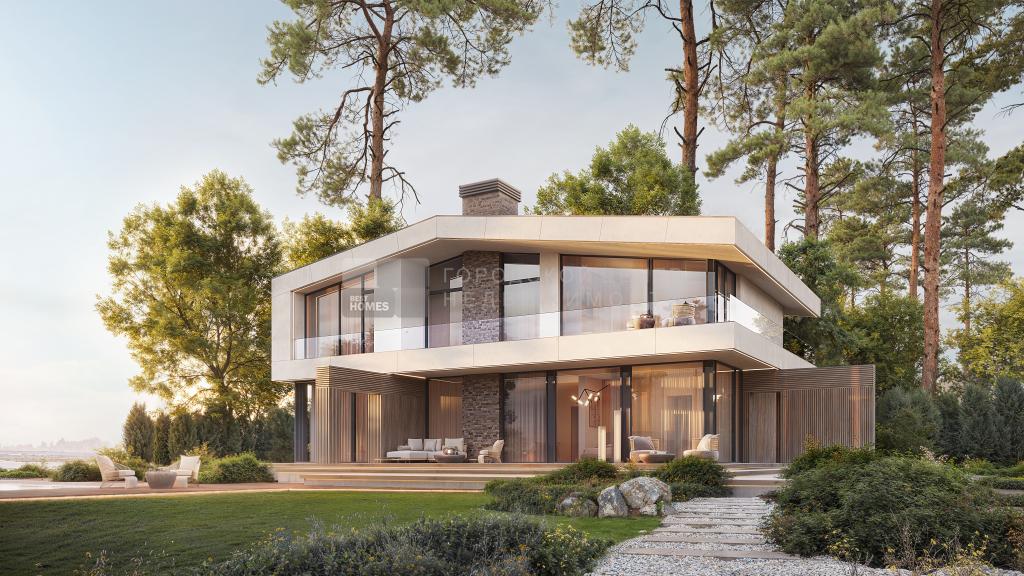 Панорамная релакс-зона в гостиной со вторым светом, камином и выходом на уютную террасу – прекрасное место для отдыха и вдохновения. Тектоничное и устойчивое формообразование, вдохновленное современной архитектурой, естественными материалами и переосмыслением стиля шале. Уютные балконы обеспечат дополнительное пространство для отдыха на природе с повышенным комфортом.