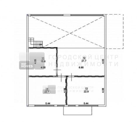 2-й этаж: 2 большие спальни с панорамными окнами, большой сан. узел с мансардным окном, холл, лестница на второй этаж.