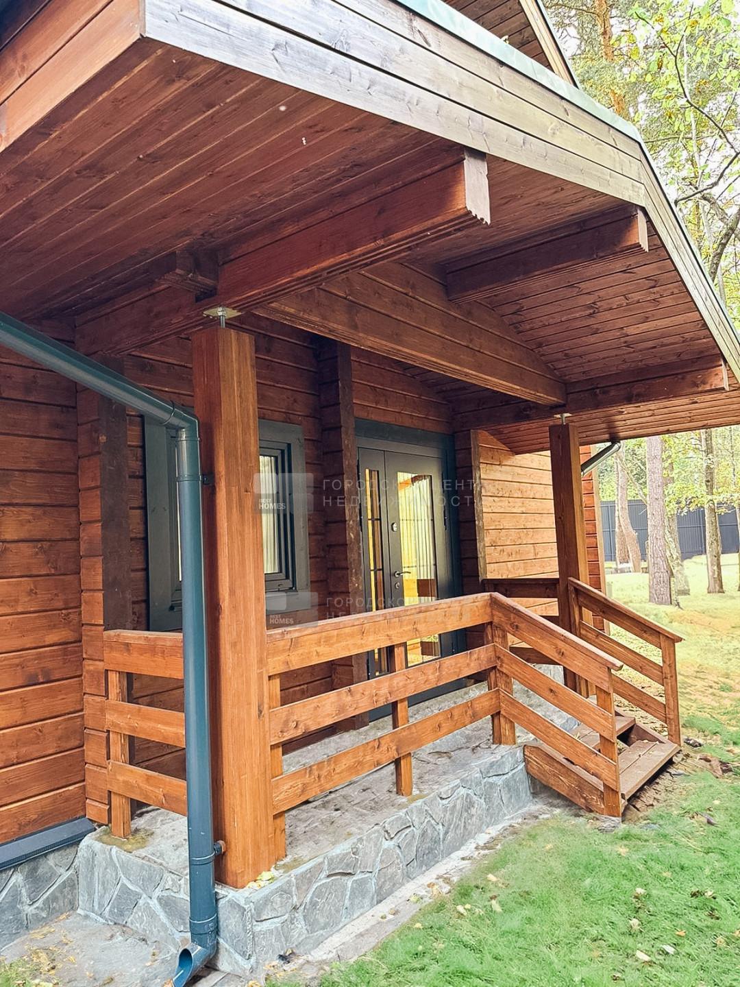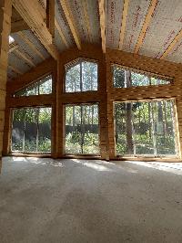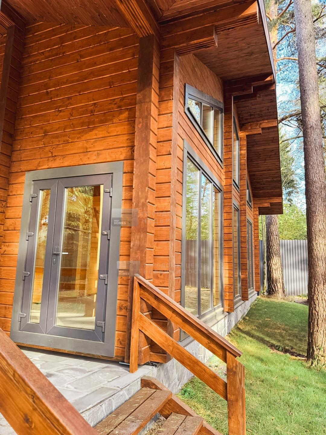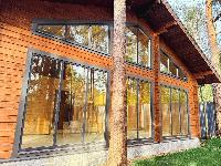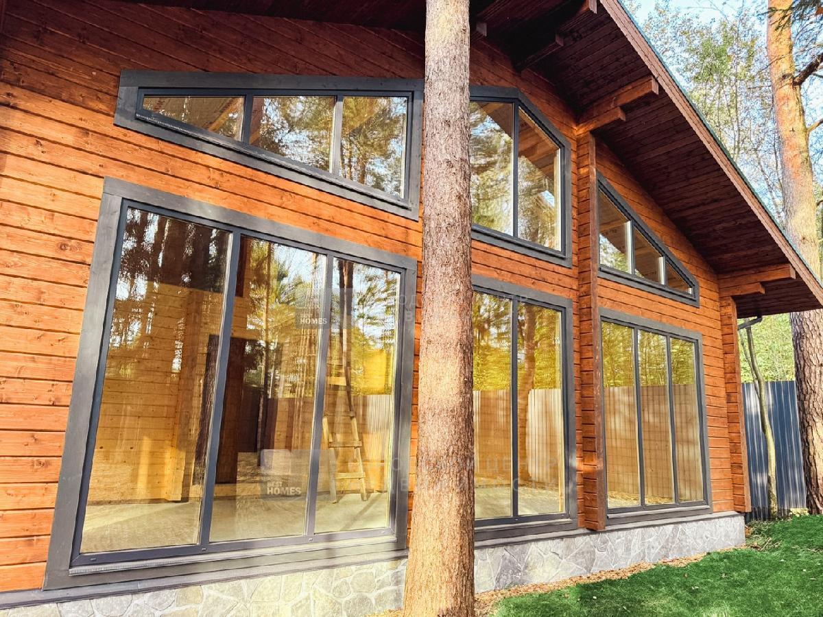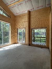 Клееный брус, бетонный монолитный фундамент ,крыша гибкая черепица, мягкая кровля, панорамные окна, ламинированные стеклопакеты, мансардные окна, широкая двойная входная дверь.