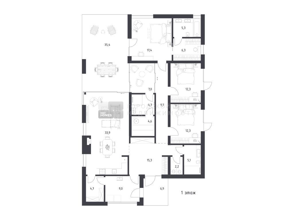 Комфортная вилла с просторной кухней-гостиной, мастер-спальней, кабинетом, гардеробной и благоустроенным и огороженным просторным участком.