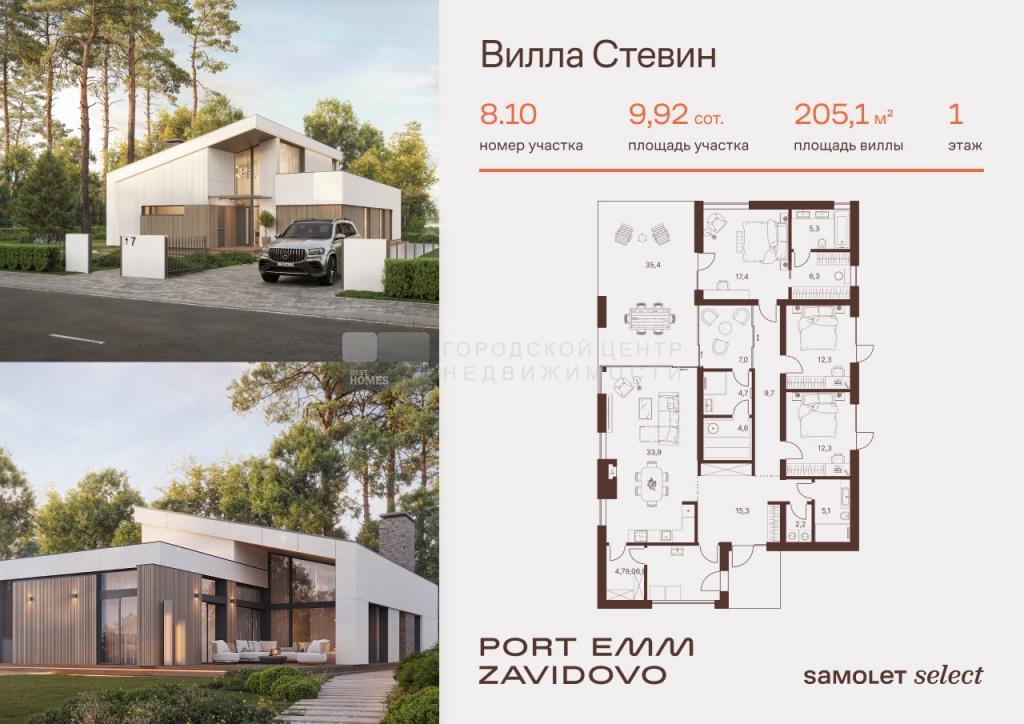В продаже вилла площадью 205,1 м2 на участке 9,92 соток от застройщика «Самолет» в загородном проекте PORT EMM ZAVIDOVO.