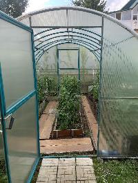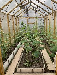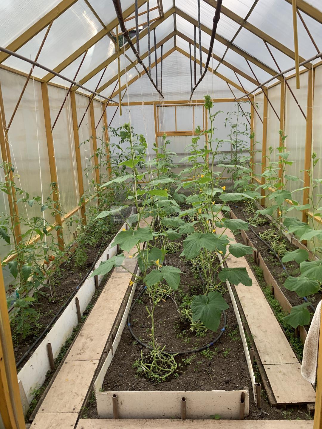 Выделена зона под огород – поставлены 2 большие теплицы, будут радовать вас урожаем – огурчики и помидорчики.