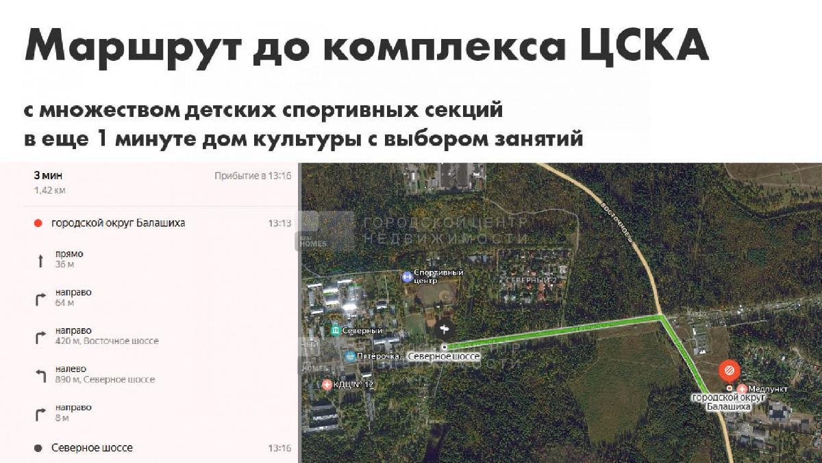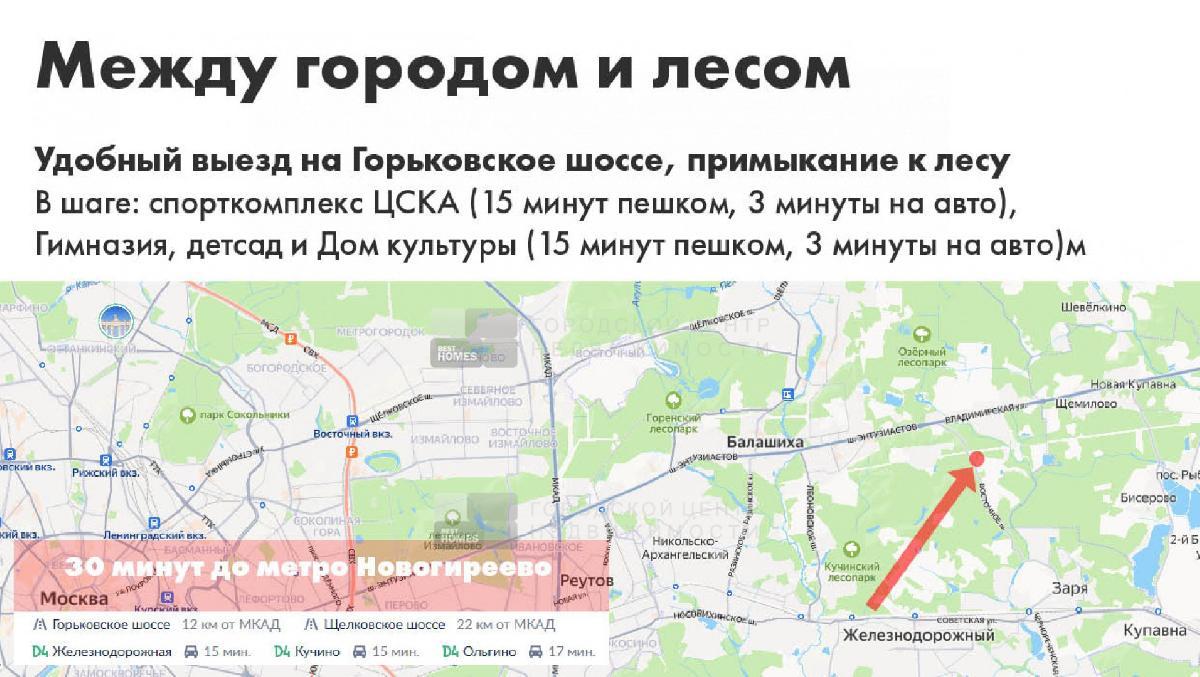 Рядом поселок Северный с инфраструктурой, необходимой для жизни круглый год - магазин, школа, детский сад, спортивные площадки, поликлиника. Легко добираться в центр Балашихи и Москву не только на машине, но и общественным транспортом - рейсовые автобусы.