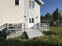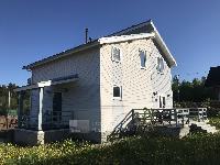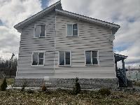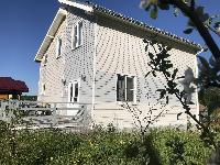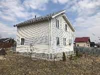 Материал дома очень теплый и современный : СИП панель. Снаружи обшит светлым сайдингом. Фундамент ж/б свайно-винтовой, обшит красивыми цокольными панелями.