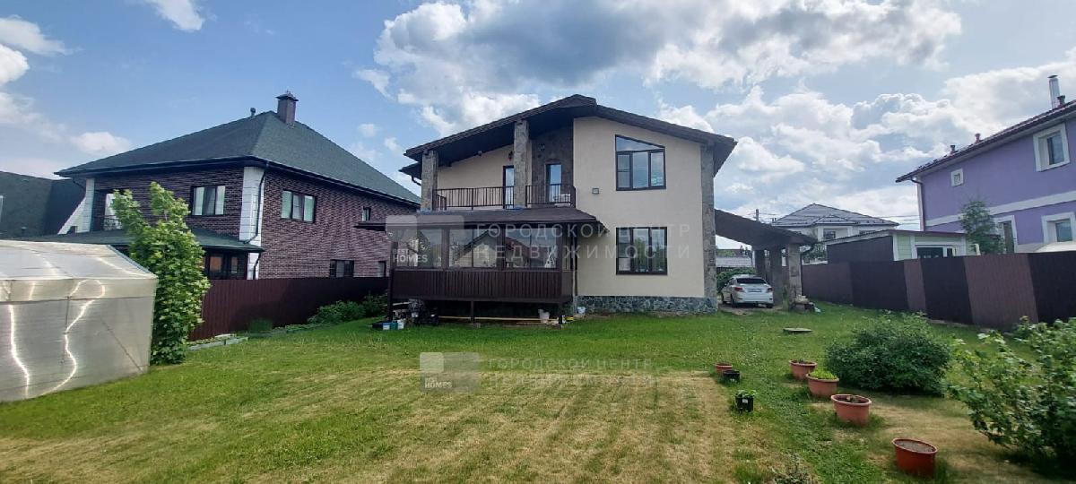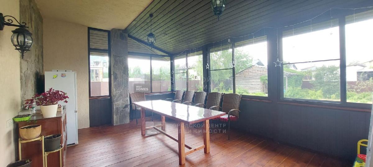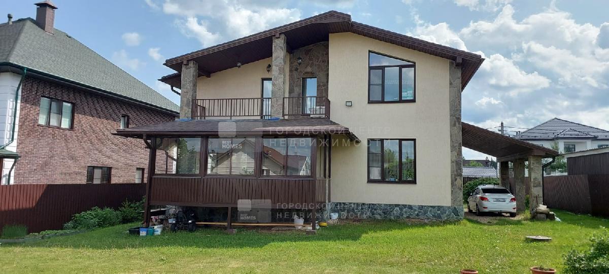 В доме имеются: прихожая, кухня-столовая, гостиная, 5 спален, 2 с/у, застекленная веранда. К дому примыкает навес для автомобиля.