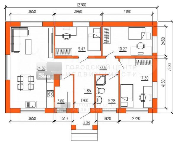 Внутри просторная планировка: три светлые спальни, прихожая, с/у и котельная.