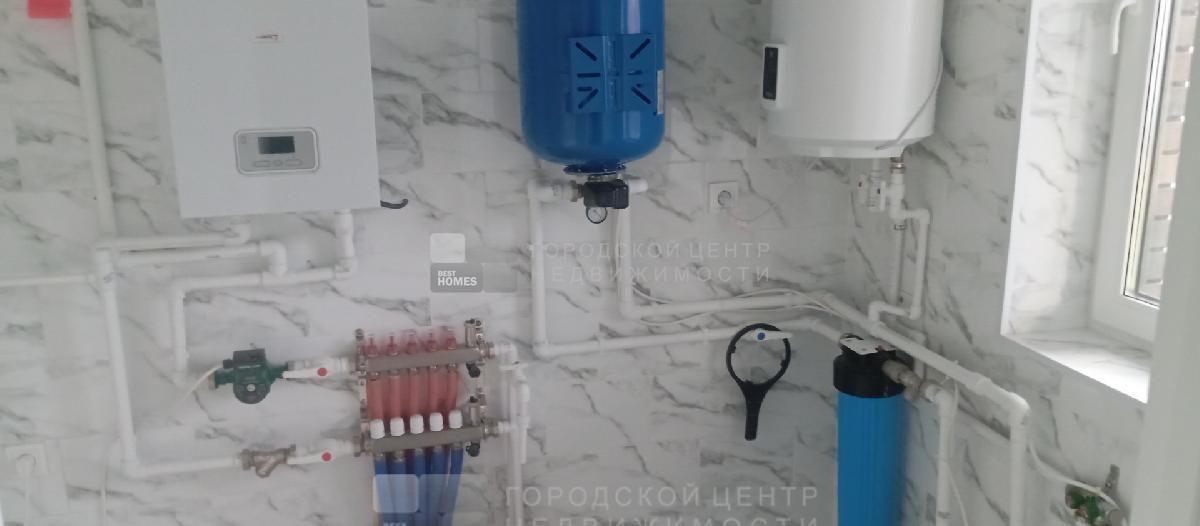 Электричество - 15 квт., установлено освещение в доме (внутренние светильники и люстры), свет на террасе и крыльце. Смонтированы теплые полы плюс пристенные конвекторы. Водоснабжение - скважина 48 м. Канализация - два по три кольца с переливом. Газ - по границе участка. Несколько соседних домов уже подключили газоснабжение.