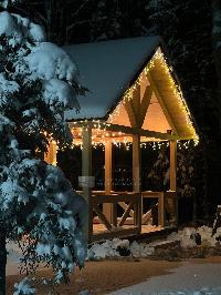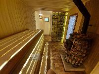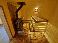 Внутри баня дополнительно утеплена вкруг. Коридор, санузел и комната отдыха отделаны имитацией бруса. Парная отделана липой, на полу плитка и настил из березы. Топочная сделана в виде красивого камина. Весь пол - подогреваемый что и является основным источником отопления.