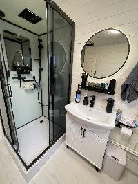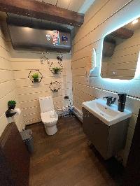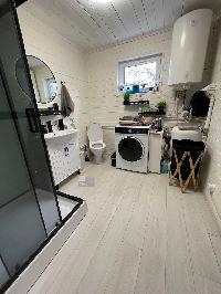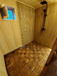 Баня 50 кв м (вместе с террасой). Сама баня 5,5 на 6 из сруба и терраса 5,5 на 4. В бане прихожая (тамбур), туалет, просторная комната отдыха и большая (11 кв м) совмещенная с душевой - парная.