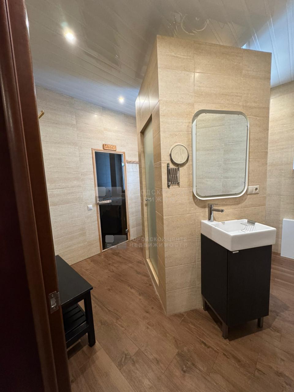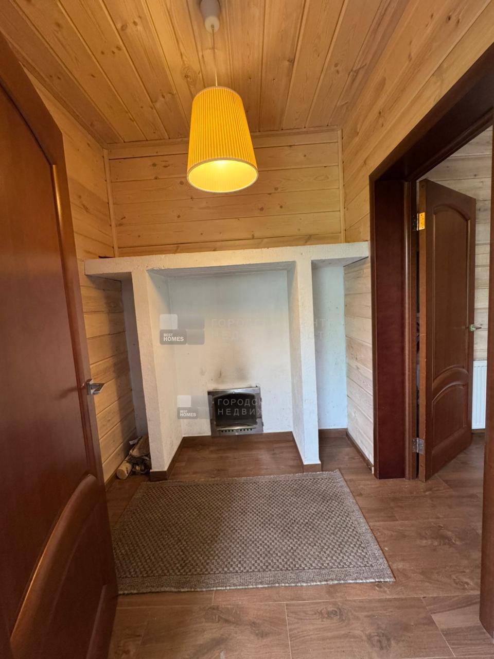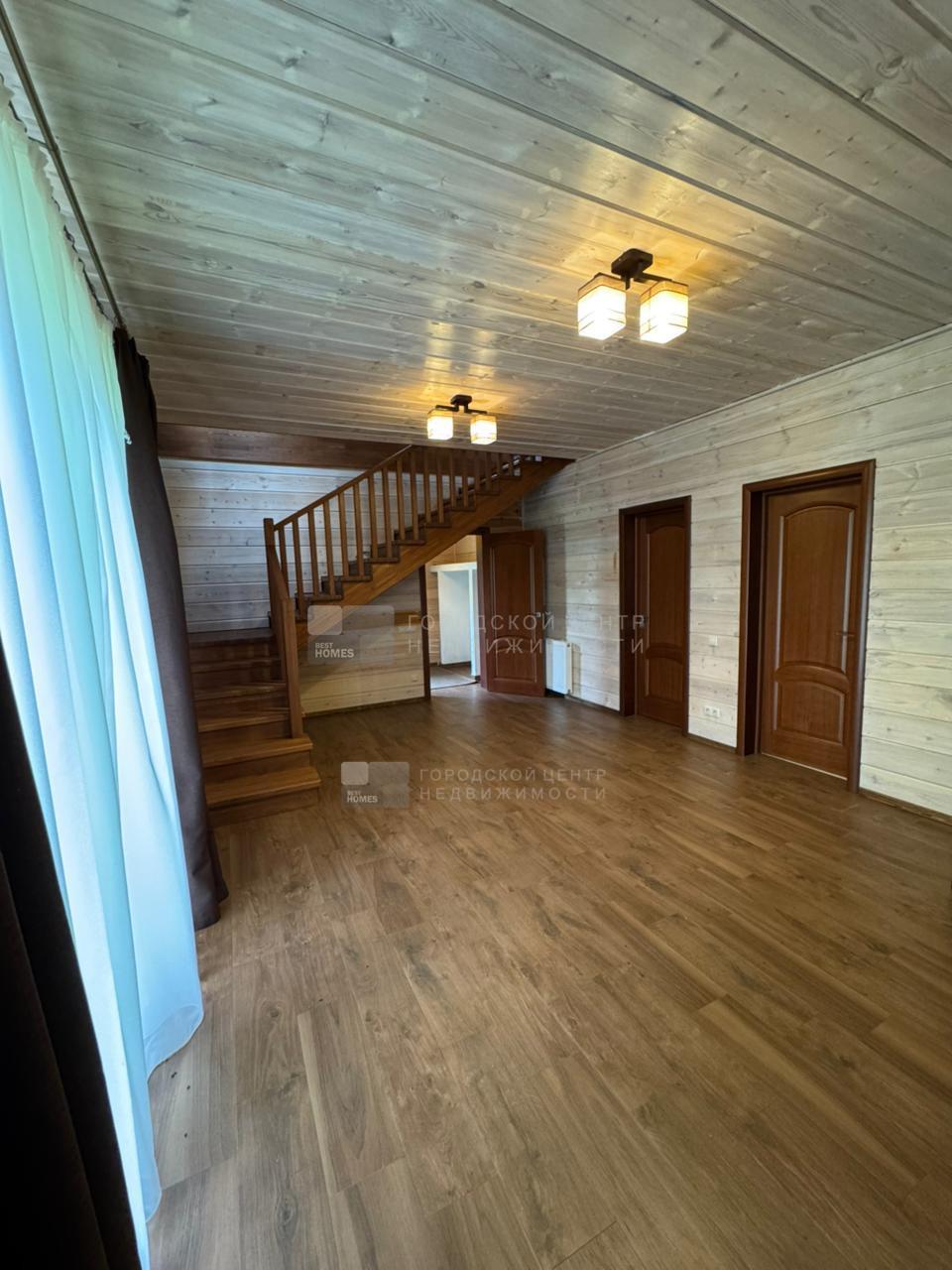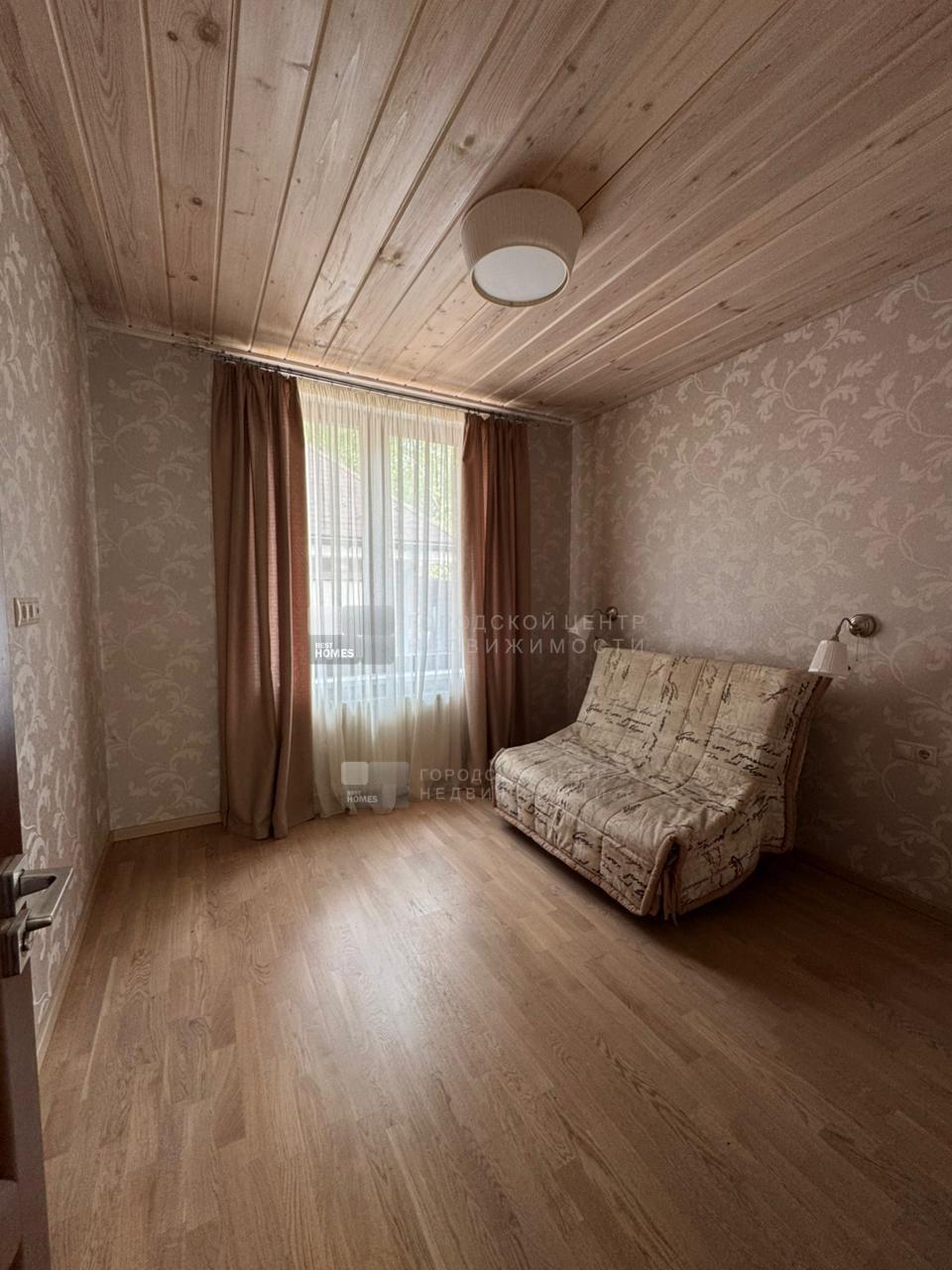 Внутри оштукатурен и покрыт имитацией бруса. В с/у на полу и на стенах плитка. Во всех помещениях 1-го этажа теплые электрические полы (кроме спальни).