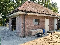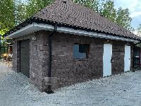 Г. Одноэтажная мастерская, включающая в себя жилое помещение для работника и хозблок для хранения техники и инвентаря. Построен из цельных блоков на ж/б фундаменте. Крыша мягкая кровля катепал. Вокруг сделана отмостка, водостоки.